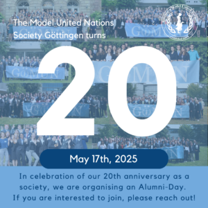 Die MUN Society Göttingen wurde im Jahr 2005 von einer Handvoll Studierender gegründet. In diesem Jahr, zur Feier unseres 20-jährigen Jubiläums, wollen wir einen Alumni-Tag für aktuelle und ehemalige Mitglieder veranstalten. Wir möchten die Gelegenheit nutzen, um auf 20 Jahre turbulente Vereinsgeschichte zurückzuschauen, Erfahrungen auszutauschen und alte Freunde zusammenzubringen.